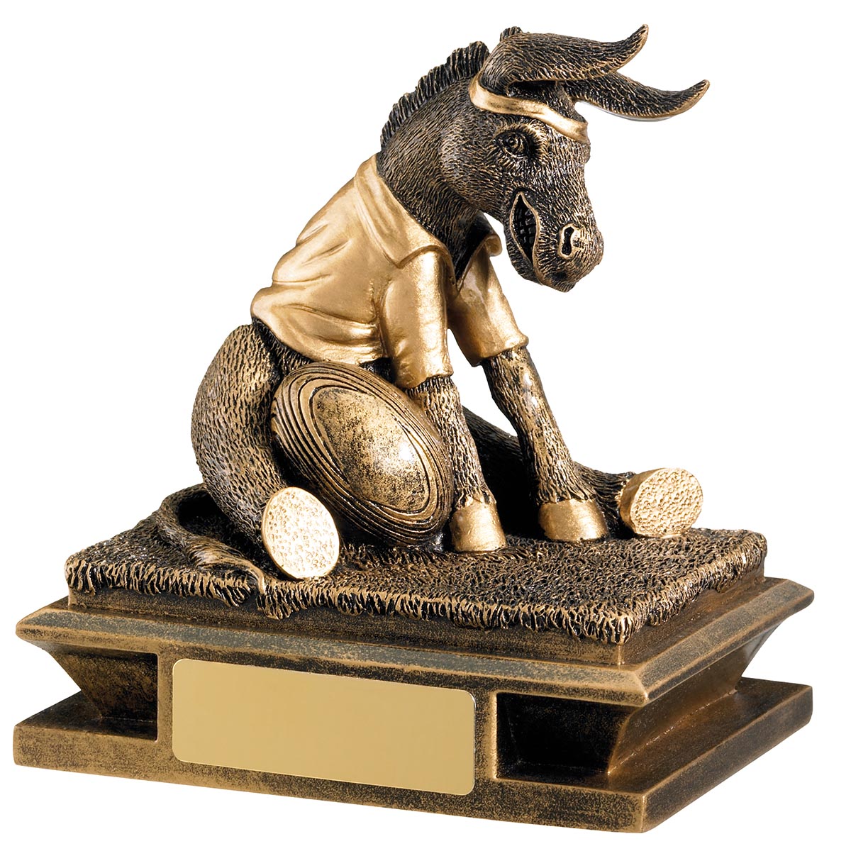 Comic Rugby Donkey trophy in gold 120mm high Features antique gold donkey with bright gold shirt on rectangular baseEngraving plate can be applied to front