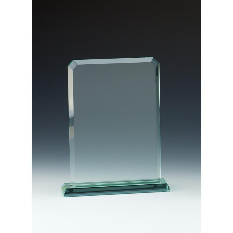140mm tall oblong shaped clear jade glass award with chiselled edges. The base glass is the same 10mm thickness as the main glass area. Ideal for engraving logos and text. Presented in a white card box