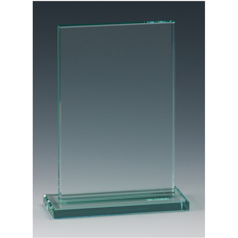 150mm portrait shaped clear jade glass award. The base glass is the same 10mm thickness as the main glass area. Ideal for engraving logos and text. Presented in a white card box