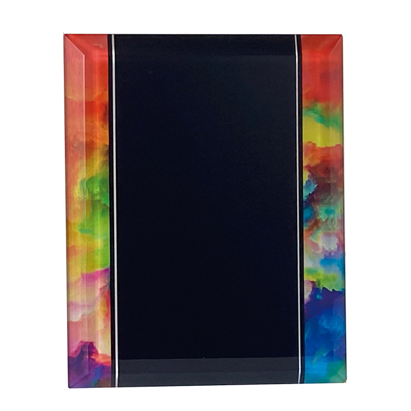 18cm black glass plaque with a multi colour edge. These awards can be laser engraved or colour printed.