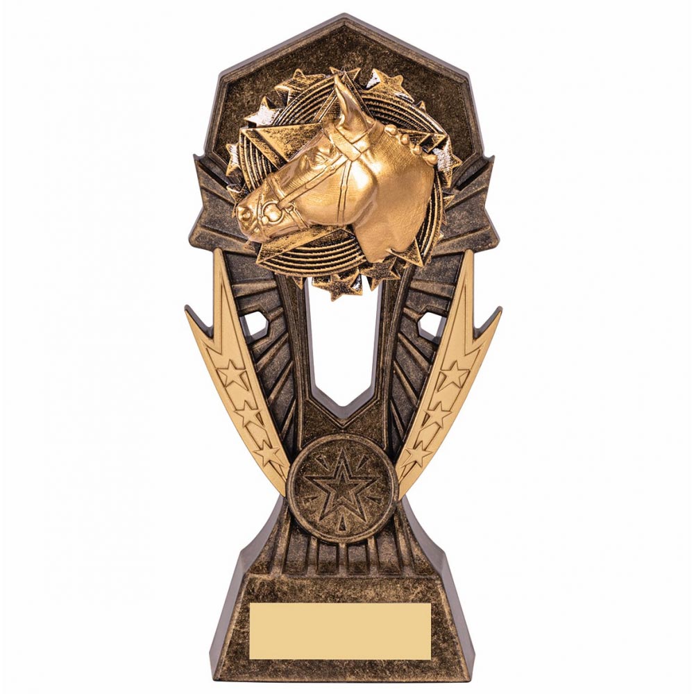 Allstar Equestrian Trophy 185mm highFeatures bright gold horse head on a co-ordinating gold stand Engraving plate and club badge can be applied to front