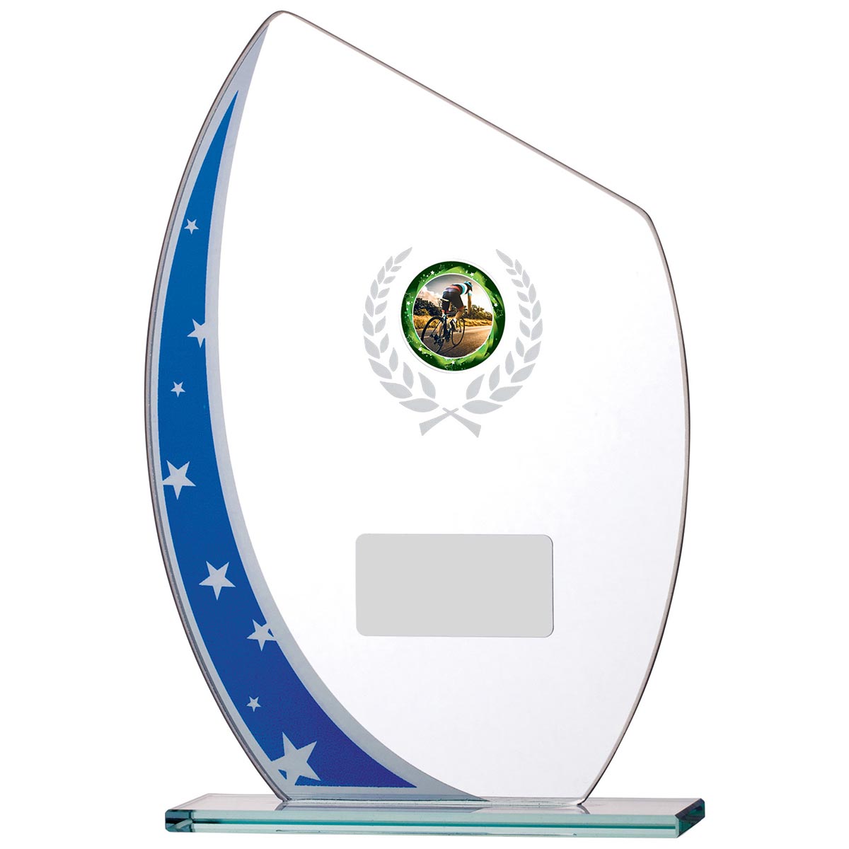 Blue Mirror Edge award 205mm highAngular clear glass award with blue and silver detailStands on a rectangular basePrice excludes engraving