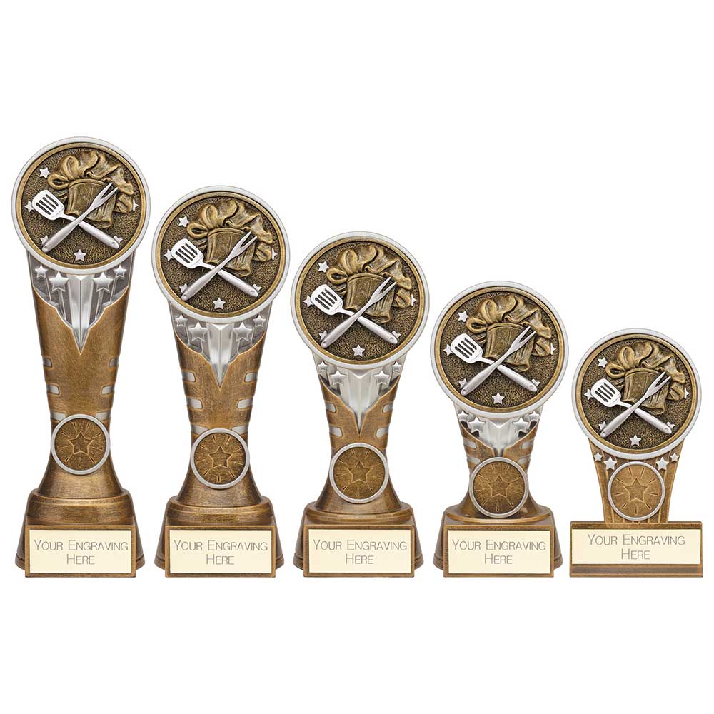 Ikon Tower Cooking Award 200mm highFeatures gold and silver cooking utensils and hat in a gold and silver stand with silver star detailEngraving plate and badge can be applied to front