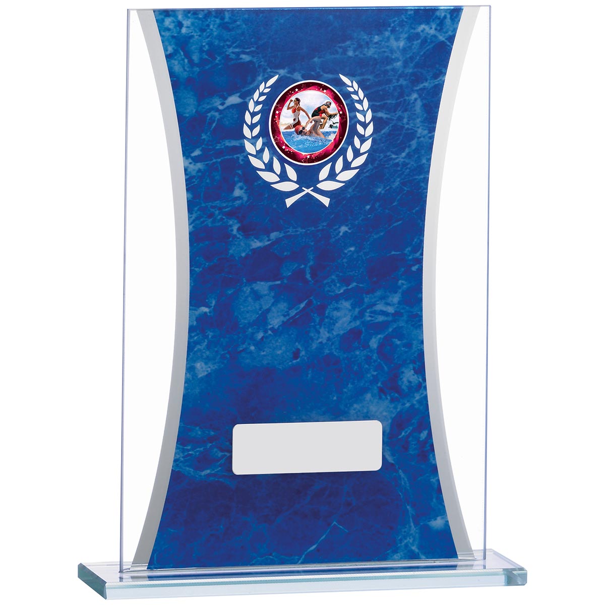 Marble Effect Glass award 185mm highRectangular award with blue marble effect centre panelStands on a rectangular basePrice excludes engraving