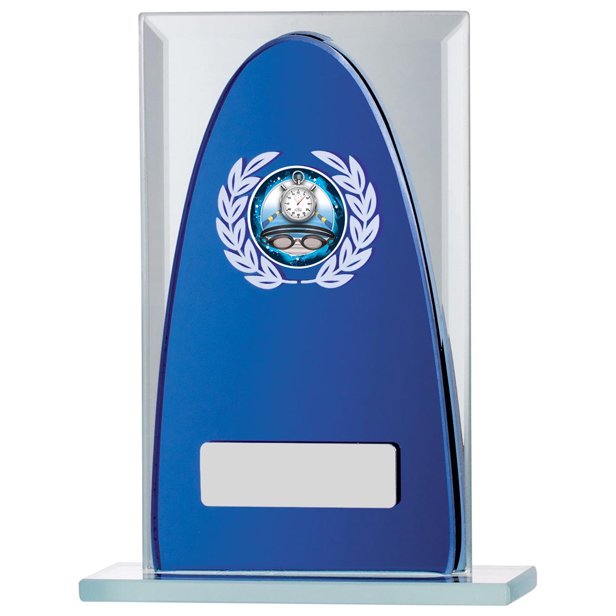 Rectangular Blue Mirror Glass award 145mm highRectangular clear glass award with blue arch detailStands on a rectangular basePrice excludes engraving