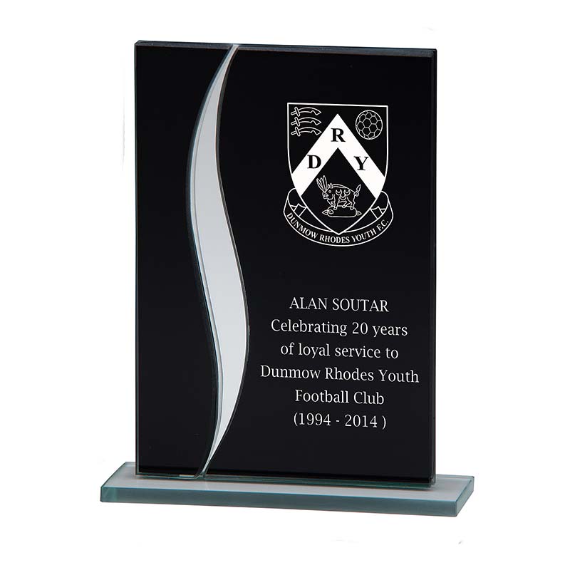Spirit Mirror glass award 165mm high 5mm deepFeatures a black glass stand with curved silver detailStands on a clear rectangular glass basePrice excludes engraving