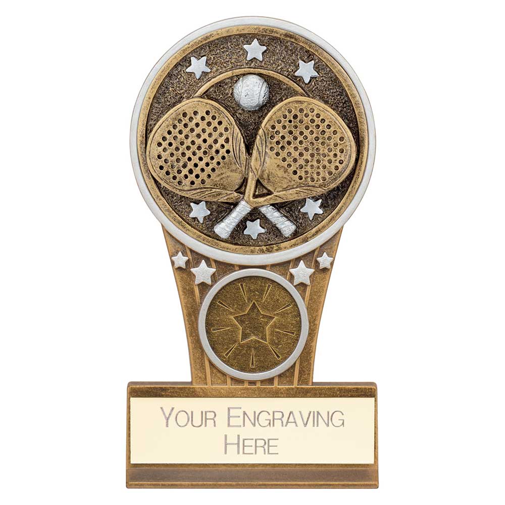 Ikon Tower Padel Trophy 125mm highFeatures rackets and ball in a gold and silver stand with silver star detailEngraving plate and team badge can be applied to front