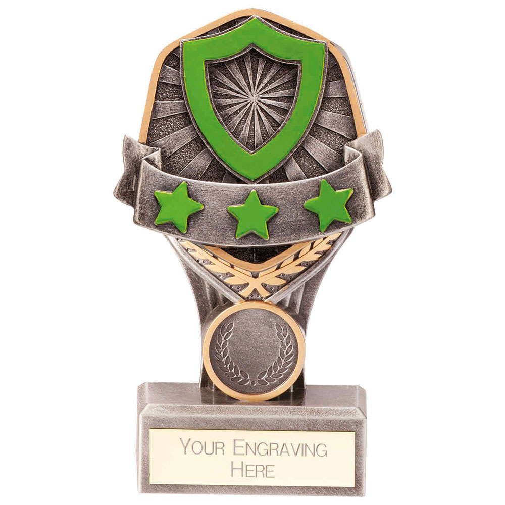 Falcon Green House award 140mm highFascia features green shield and stars set on silver plastic column with star detailEngraving plate can be applied to front