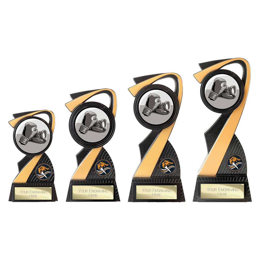 Mania Boxing trophy 155mm highFeatures boxing gloves set within black and gold towerEngraving plate and club badge can be applied to front