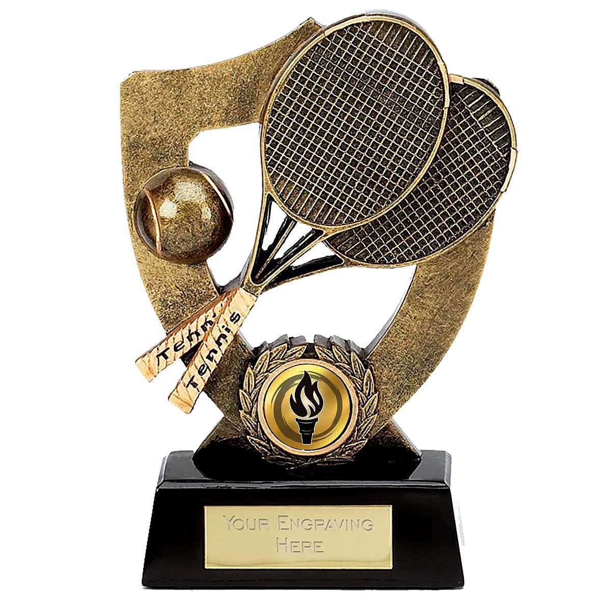 Celebration Shield Tennis Trophy in resin 7in 175mm highFeatures racquets and ball inside shieldStands on rectangular black baseEngraving plate and club badge can be applied to front