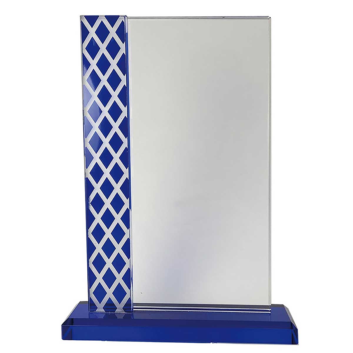 185mm left blue edge with silver diamond pattern plain glass plaque. 10mm deep quality weight. These awards can be laser engraved or colour printed.