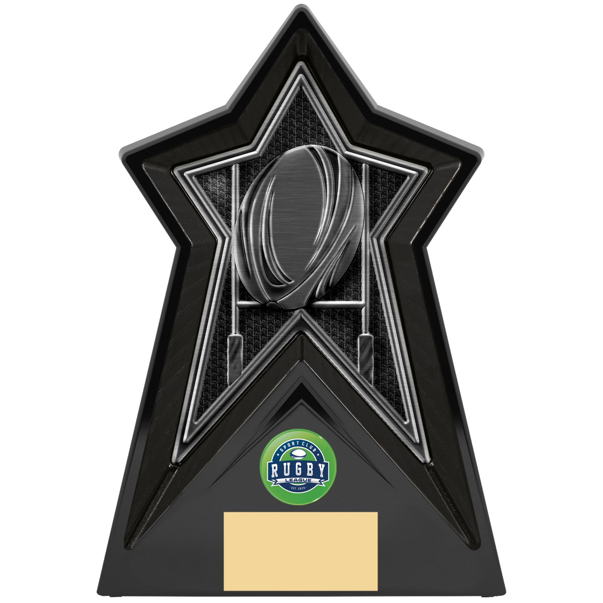 Starforce Black Rugby trophy 200mm highFeatures black star with detailed rugby centreEngraving plate and club badge can be applied to front