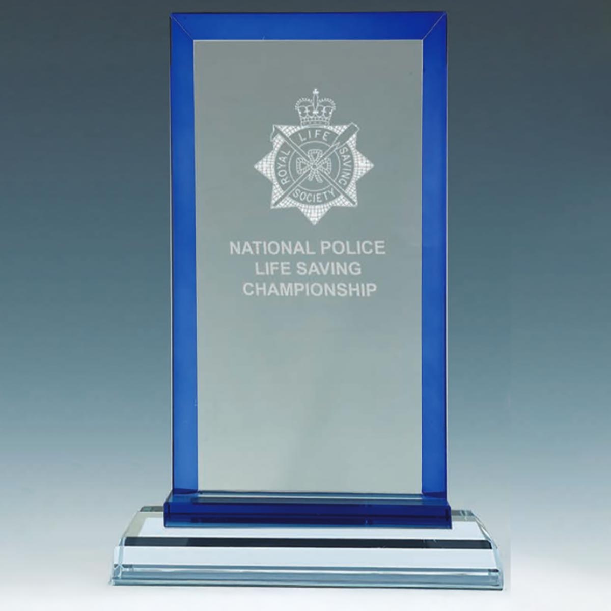 20cm blue edge plain glass plaque. 10mm deep quality weight. These awards can be laser engraved or colour printed.