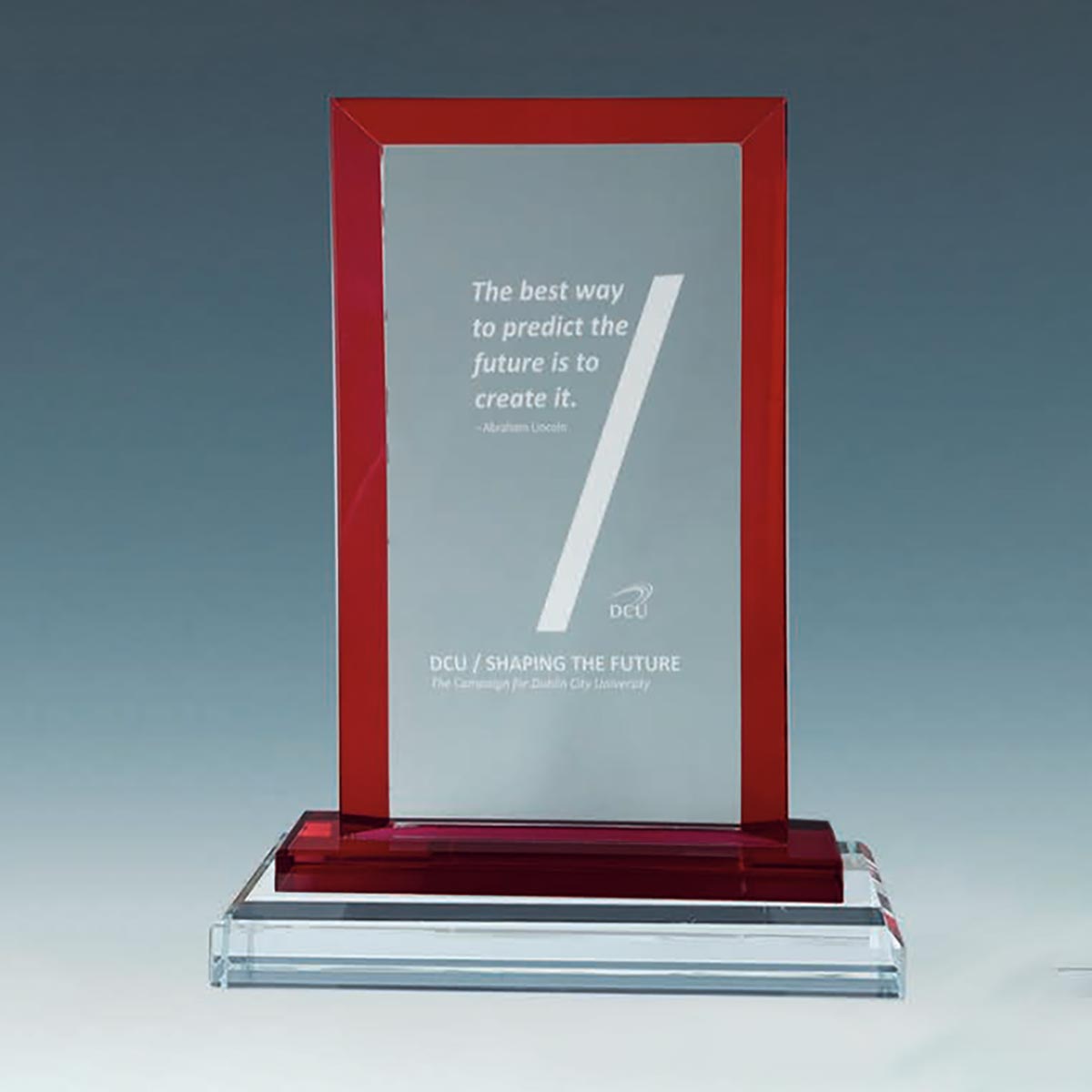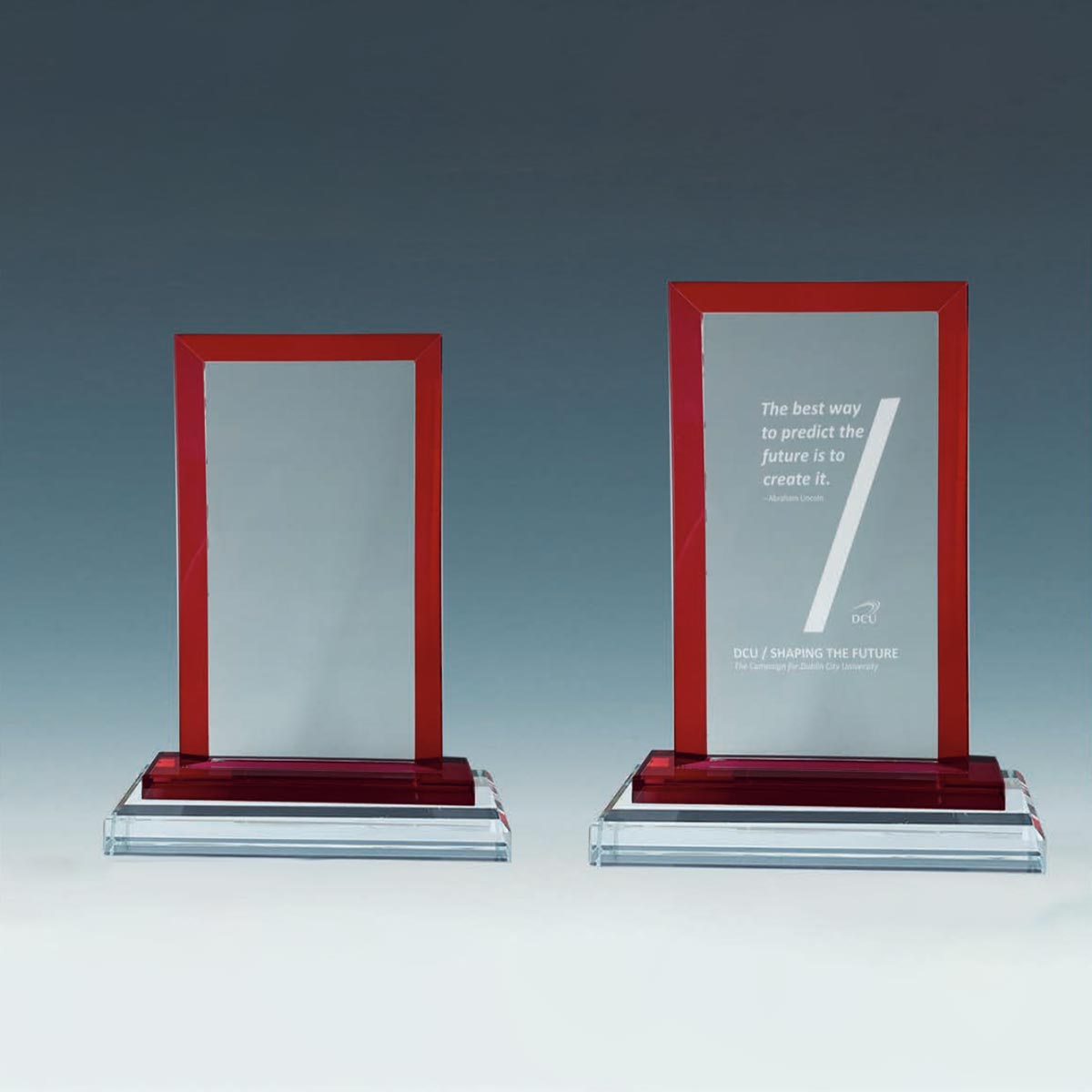 20cm red edge plain glass plaque. 10mm deep quality weight. These awards can be laser engraved or colour printed.