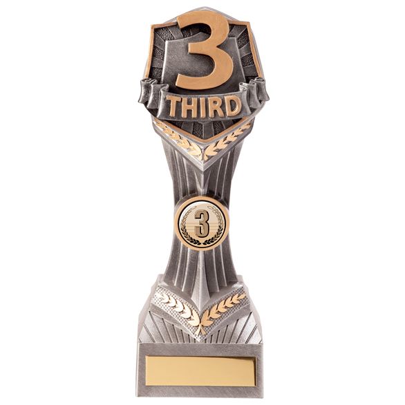 Falcon 3rd trophy 210mm highFascia features numeral and wording in gold set on co-ordinating gold and silver columnEngraving plate and badge can be applied to front