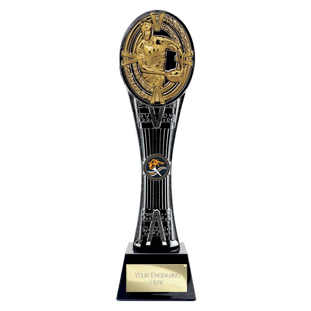 Maverick Extreme Rugby trophy 290mm highFeatures metallic gold fascia set within detailed black towerEngraving plate and team badge can be applied to front
