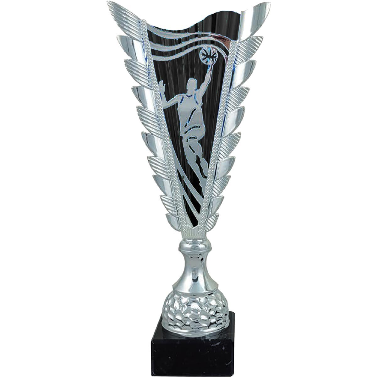 Fuego Basketball Award in plastic and marble 370mm highFeatures silver basketball player with metallic black background