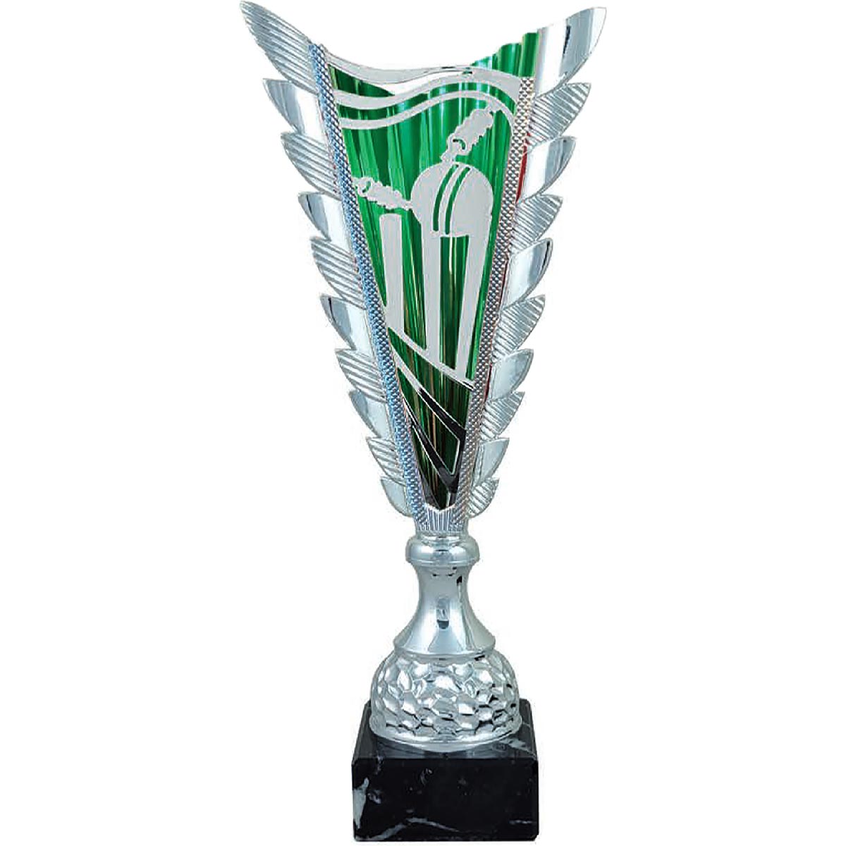 Fuego Cricket Wicket Award in plastic and marble 370mm highFeatures silver stumps and ball with metallic green background