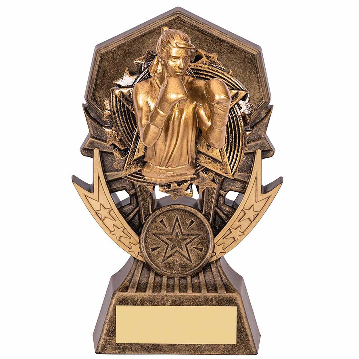 Allstar Boxing Female Trophy 145mm highFeatures boxing female on a co-ordinating gold stand Engraving plate and club badge can be applied to front