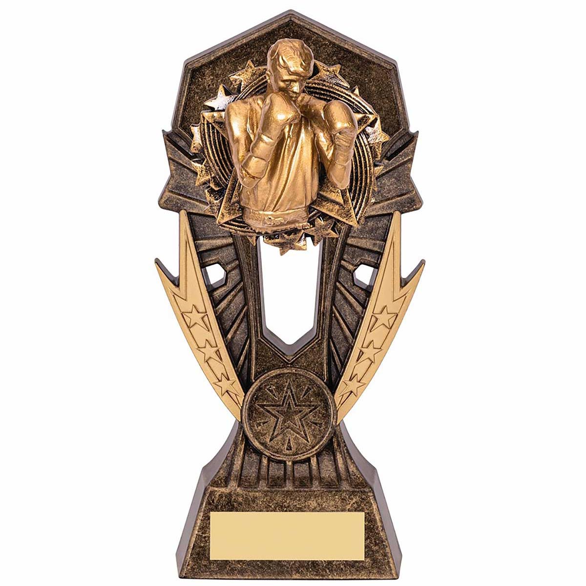 Allstar Boxing Male Trophy 185mm highFeatures boxing male on a co-ordinating gold stand Engraving plate and club badge can be applied to front
