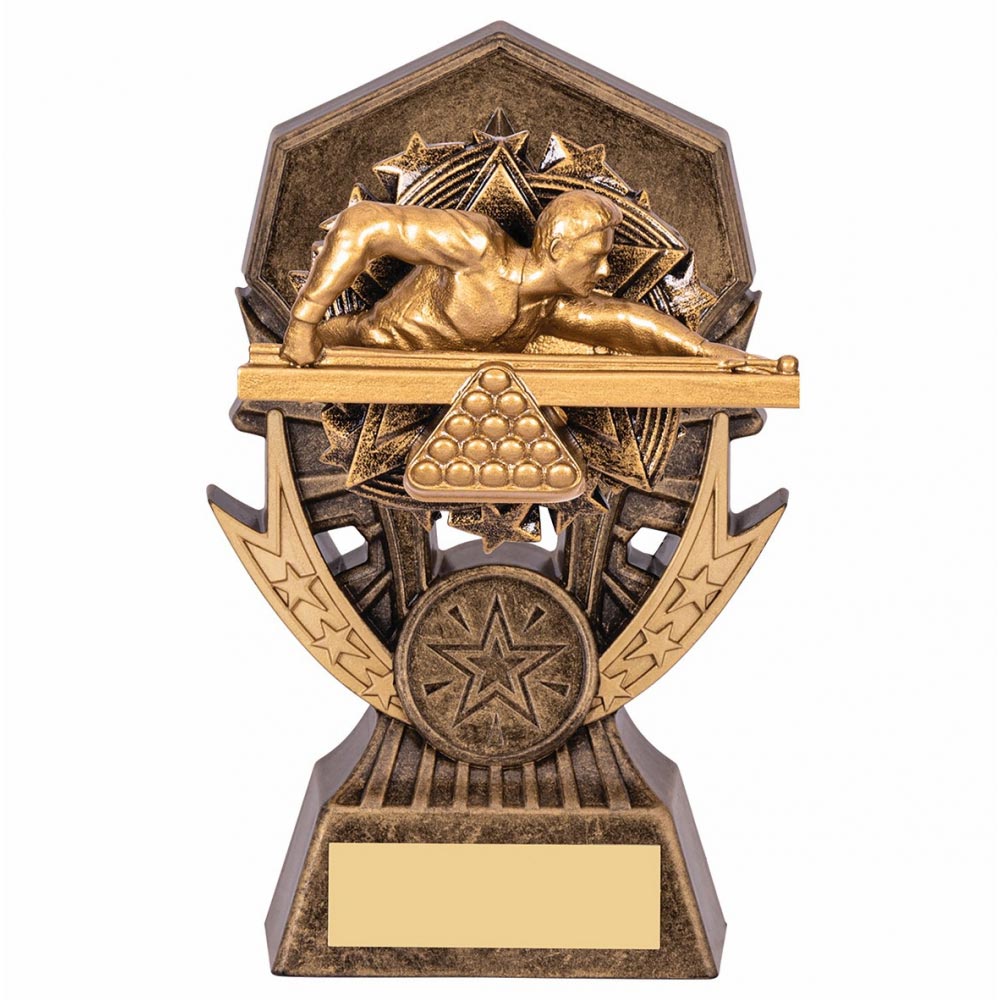 Allstar Pool Snooker Male Trophy 145mm highFeatures male player in bright gold on a co-ordinating gold stand Engraving plate and club badge can be applied to front