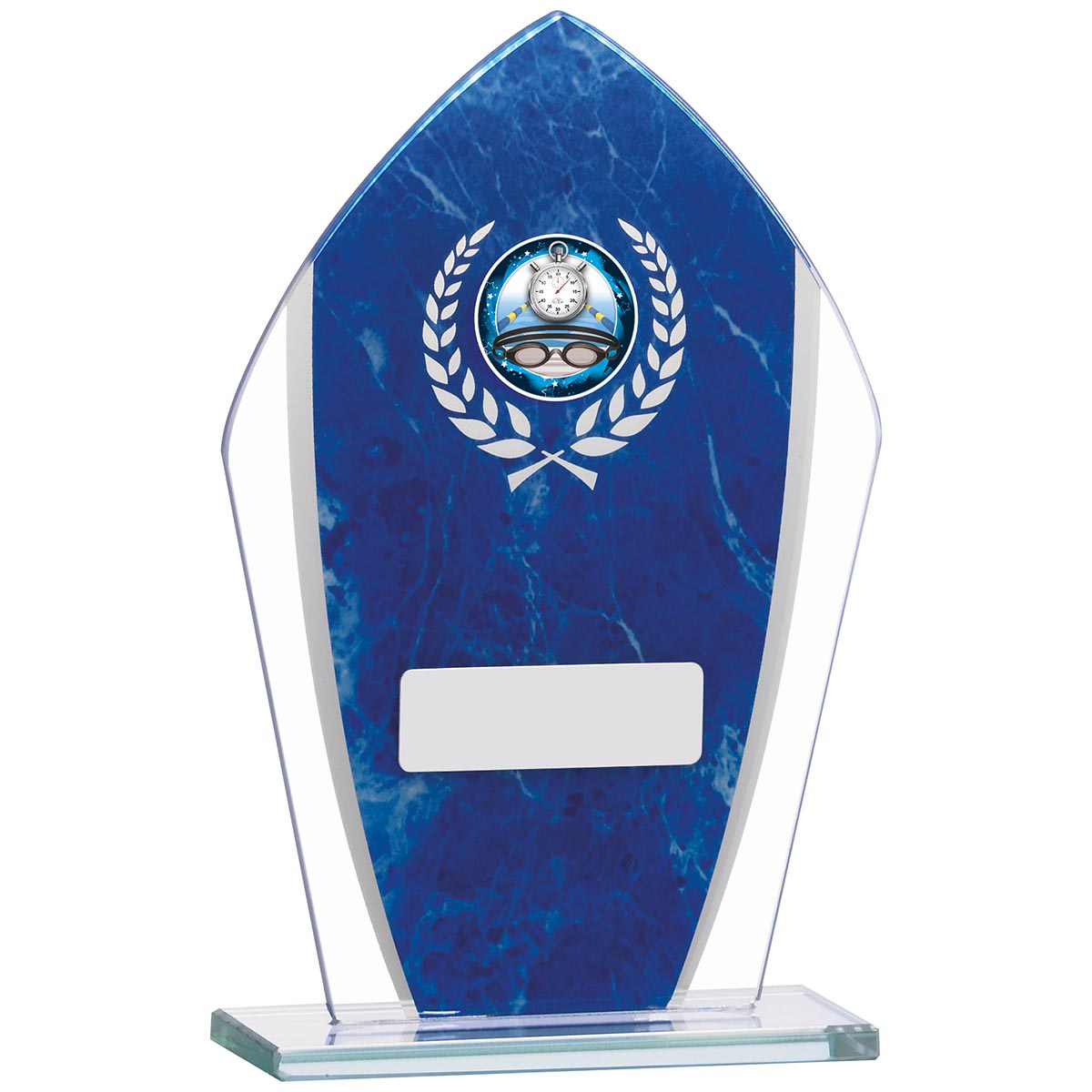 Arched Marble Effect Glass award 165mm highArched award with blue marble effect centre panelStands on a rectangular basePrice excludes engraving