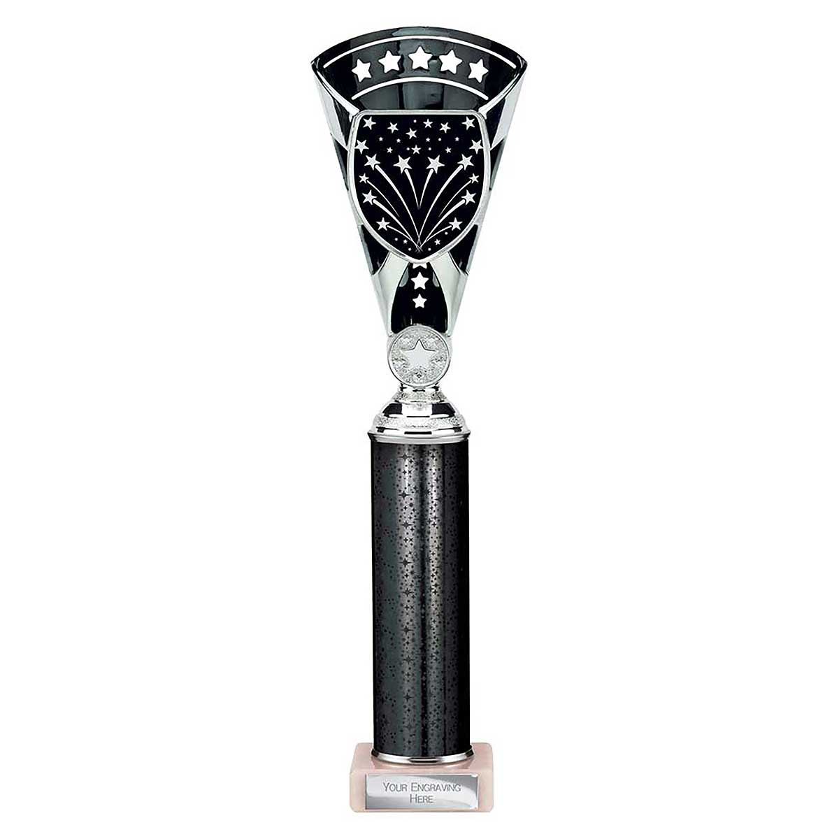 Black Silver Cobra Cup Trophy 355mm Star design sticker on the front of the cup with sparkly column and stone base A custom sticker, engraving plate and club badge can be applied to the front