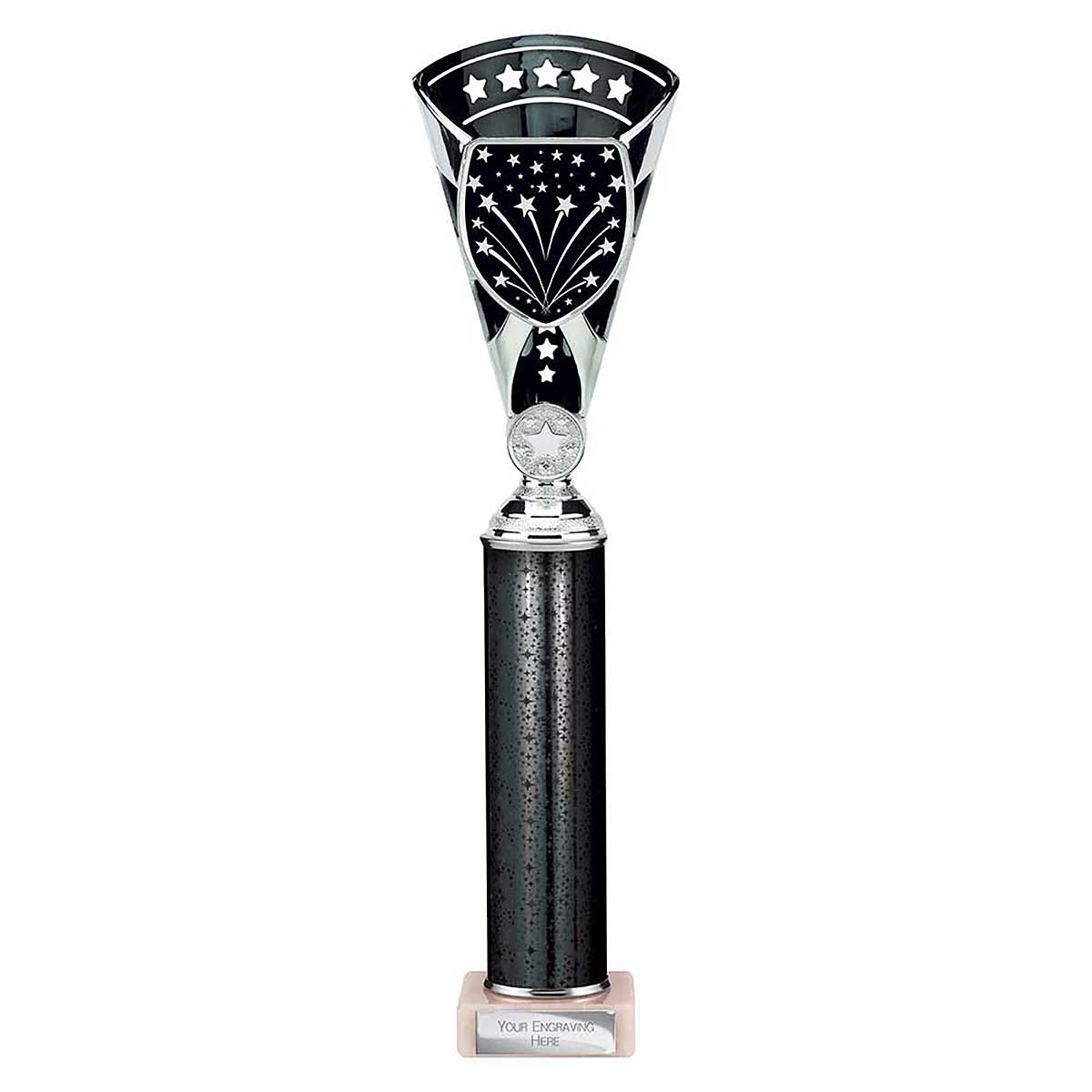 Black Silver Cobra Cup Trophy 380mm Star design sticker on the front of the cup with sparkly column and stone base A custom sticker, engraving plate and club badge can be applied to the front