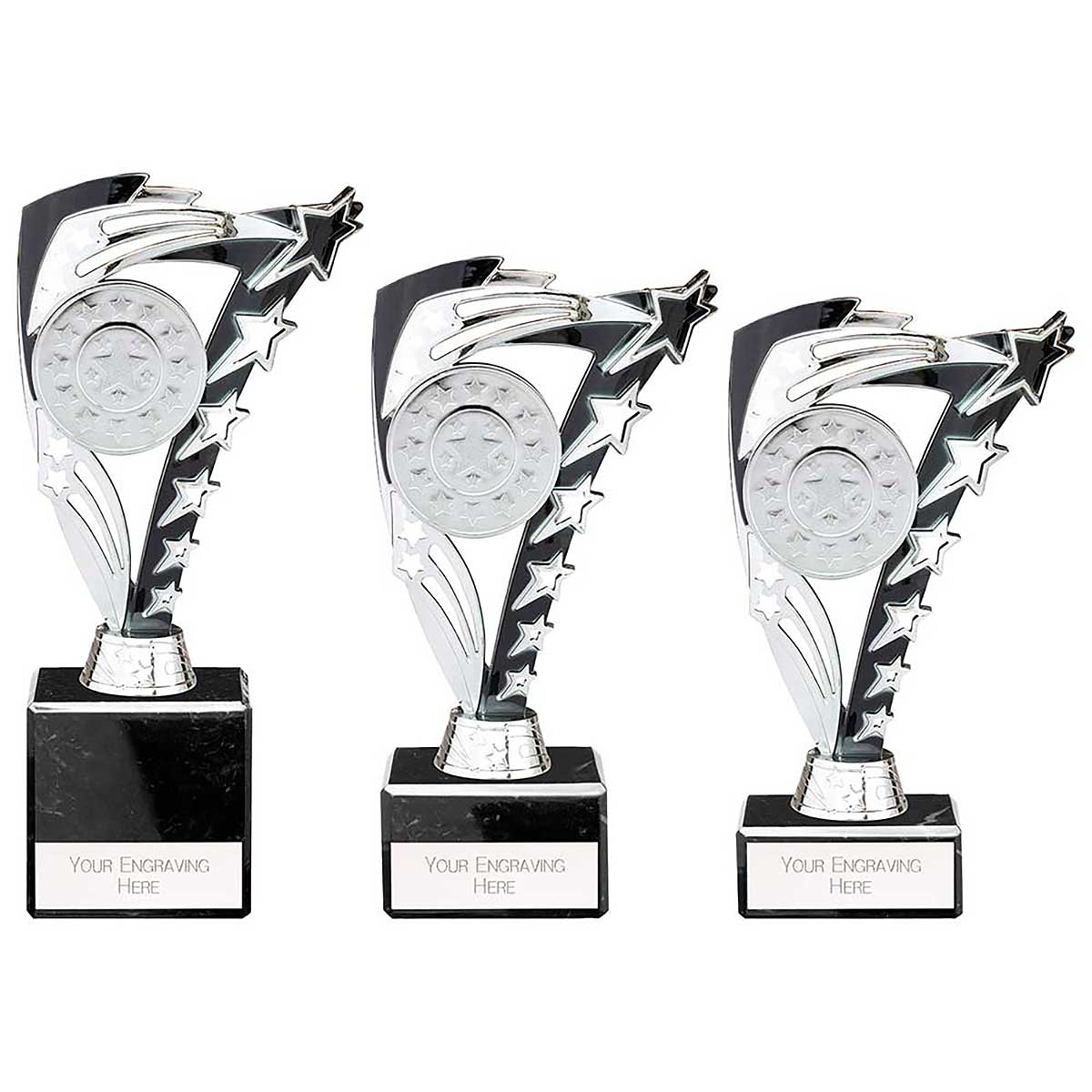 Black and silver Frenzy Multisport Trophy 185mm high Moulded plastic design on a black marble baseEngraving plate and club badge can be applied to the front