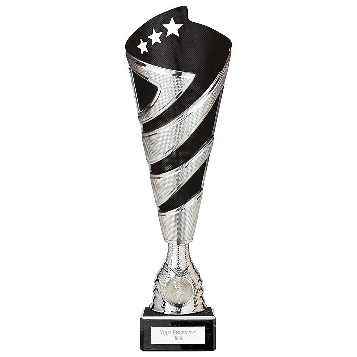 Black Hurricane Altitude Multisport Trophy 310mm high Textured plastic design on a silver riser and black stone base Engraving plate and club badge can be applied to the front
