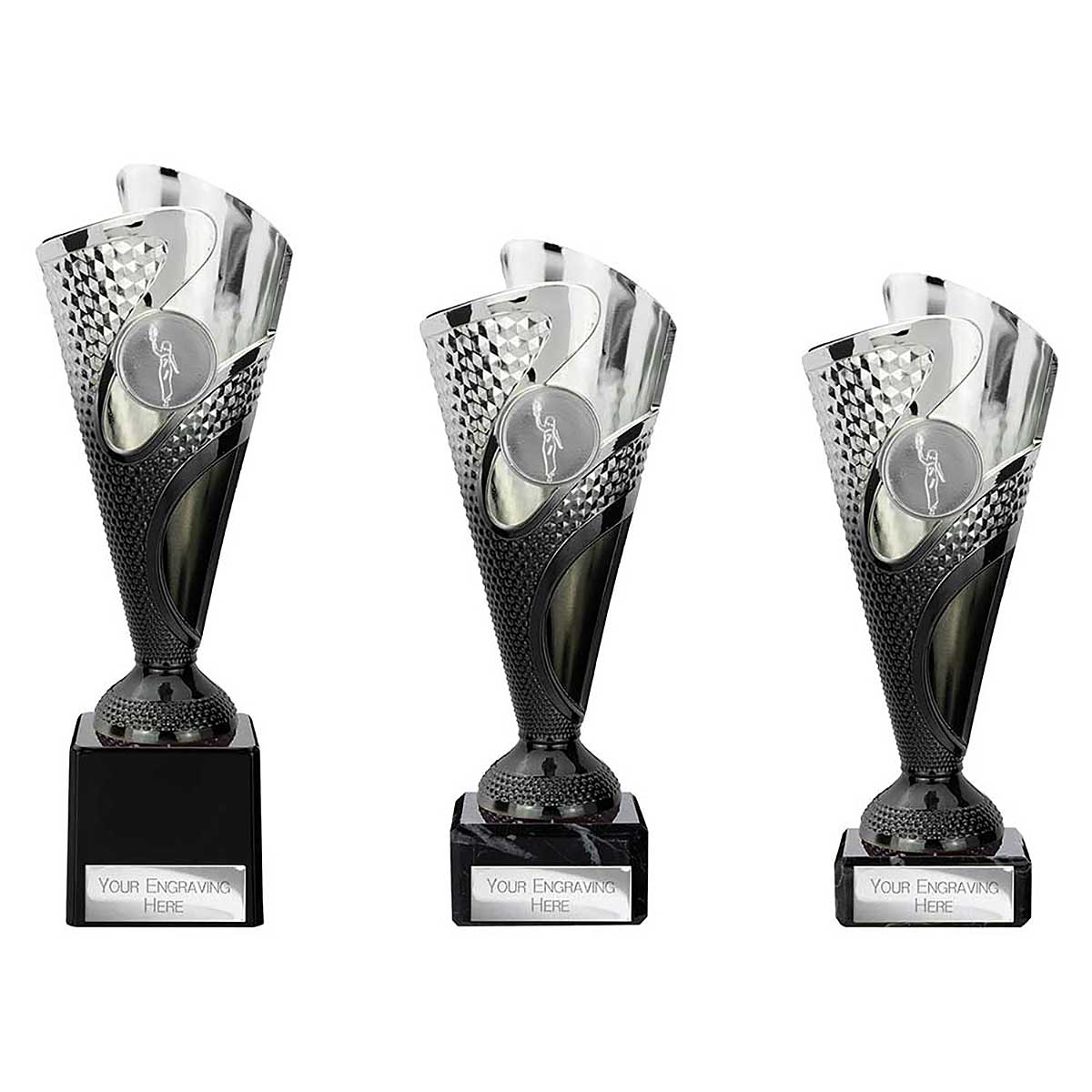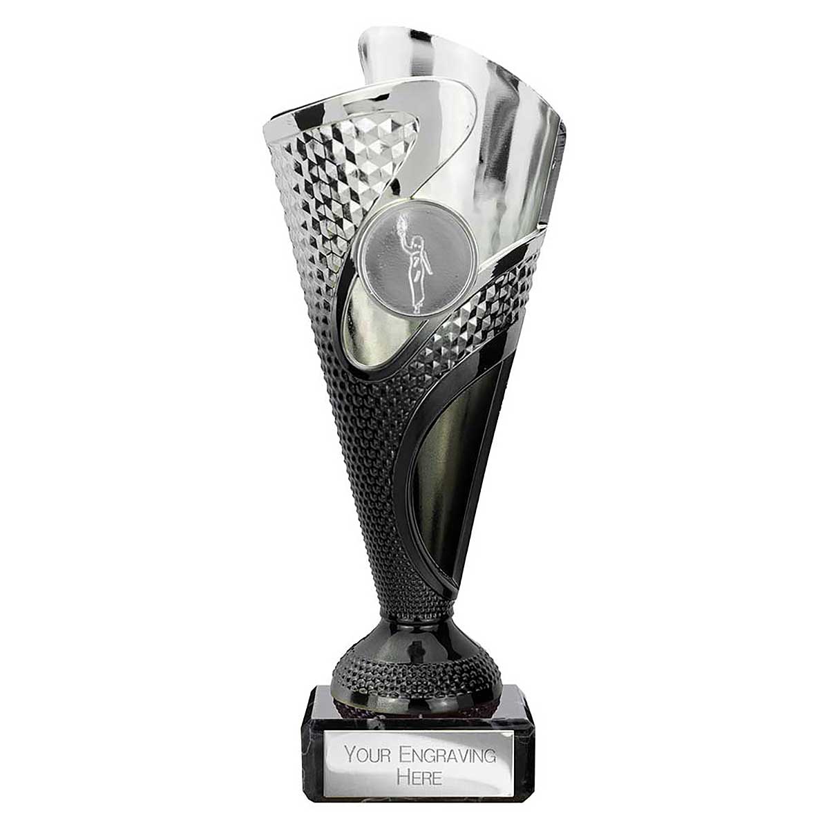 Black Silver Rodeo Multsport Award 185mm high Modern design plastic flute on a heavy stone base Engraving plate and club badge can be applied to the front