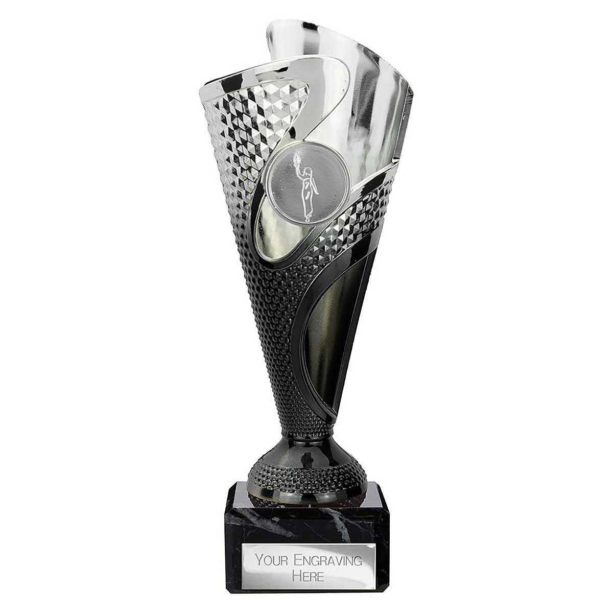 Black Silver Rodeo Multsport Award 195mm high Modern design plastic flute on a heavy stone base Engraving plate and club badge can be applied to the front