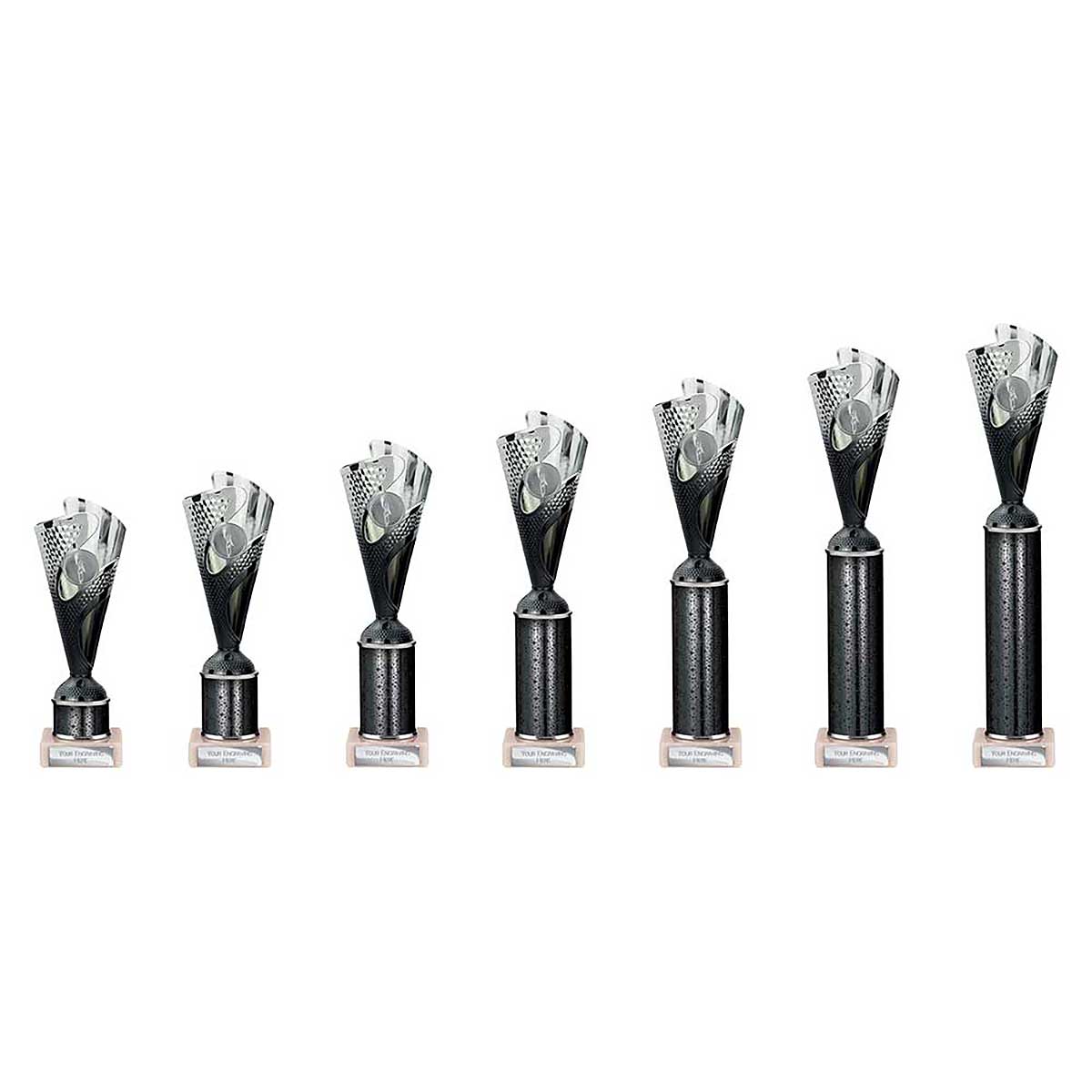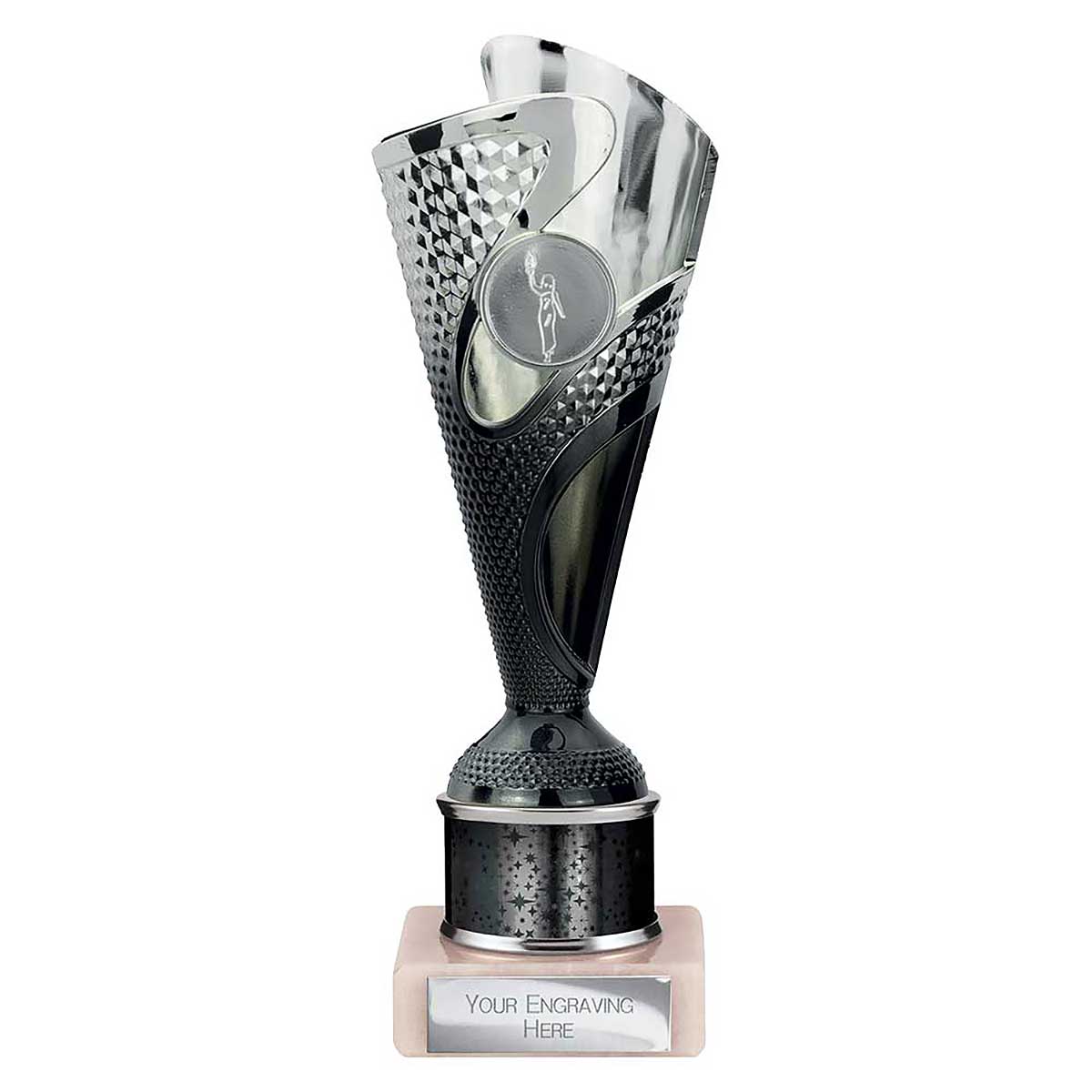Black Silver Rodeo Multsport Award 215mm high Modern design plastic flute on a sparkly column and stone base Engraving plate and club badge can be applied to the front