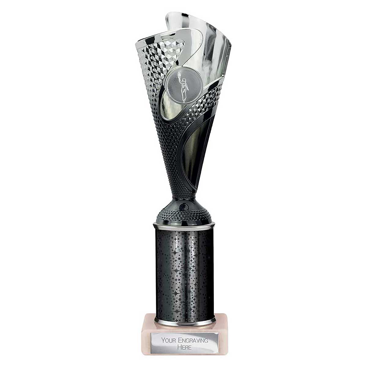 Black Silver Rodeo Multsport Award 265mm high Modern design plastic flute on a sparkly column and stone base Engraving plate and club badge can be applied to the front