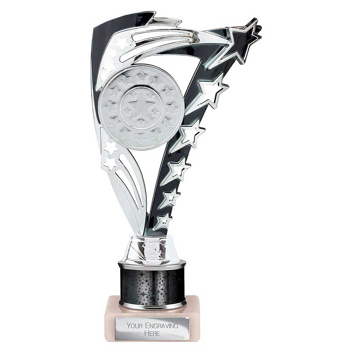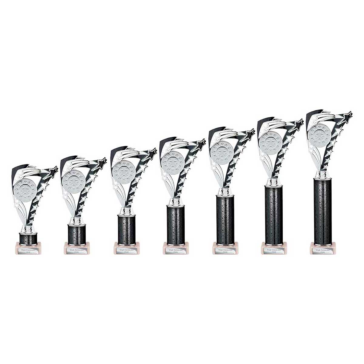 Black and silver Super Frenzy Multisport Trophy 215mm high Moulded plastic design on a glitter column and stone base Engraving plate and club badge can be applied to the front