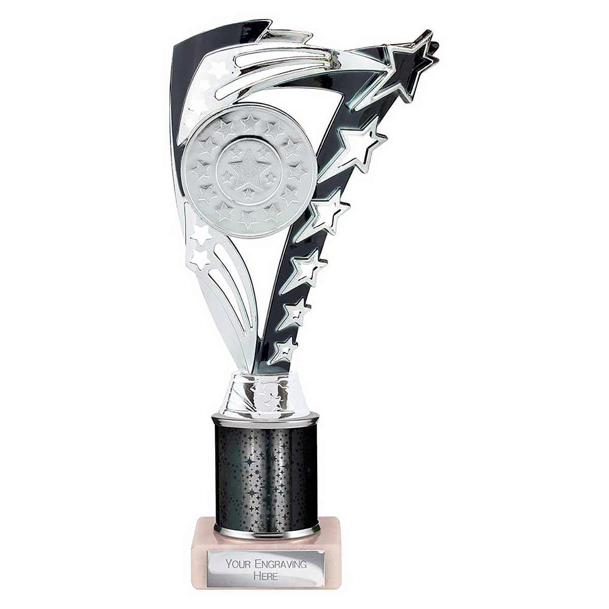 Black and silver Super Frenzy Multisport Trophy 240mm high Moulded plastic design on a glitter column and stone base Engraving plate and club badge can be applied to the front