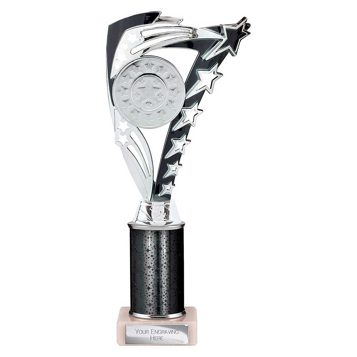 Black and silver Super Frenzy Multisport Trophy 265mm high Moulded plastic design on a glitter column and stone base Engraving plate and club badge can be applied to the front
