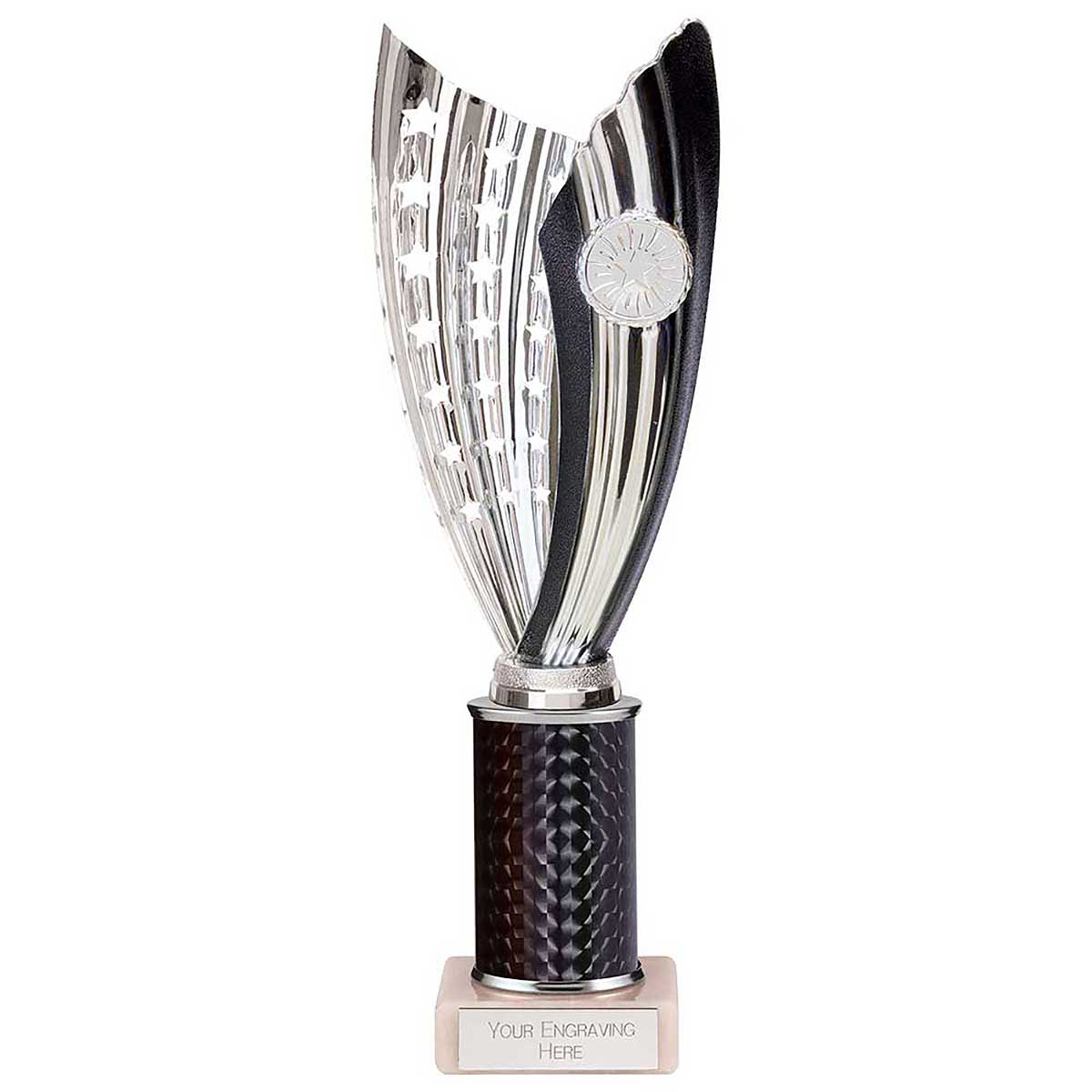 Black and silver Glamstar trophy 265mm Plastic silver star and coloured curve on a sparkly column and stone baseEngraving plate and club badge can be applied to the front