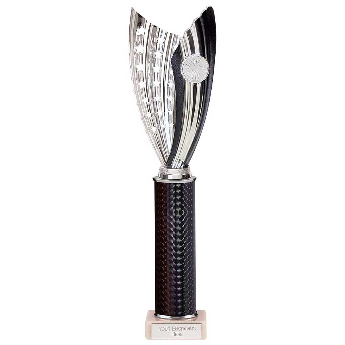 Black and silver Glamstar trophy 390mm Plastic silver star and coloured curve on a sparkly column and stone baseEngraving plate and club badge can be applied to the front