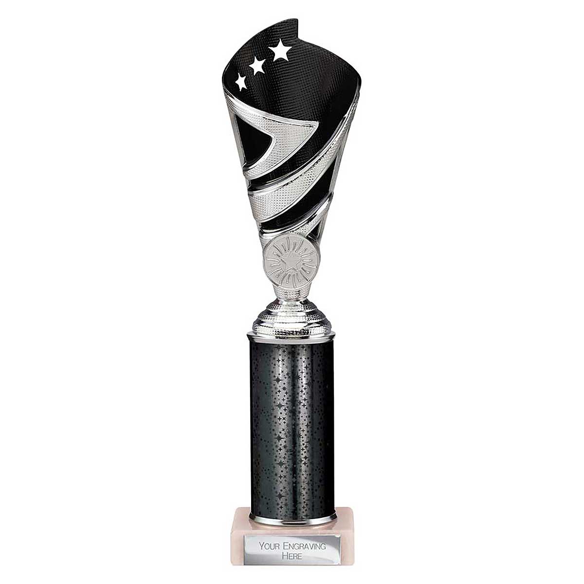 Black and silver Super Hurricane Multisport Trophy 275mm high Textured plastic design on a glitter column and stone base Engraving plate and club badge can be applied to the front