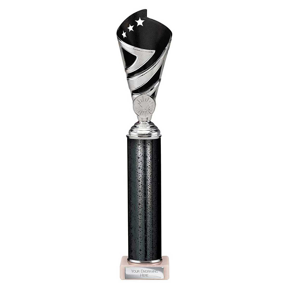 Black Super Hurricane Multisport Trophy 350mm high Textured plastic design on a glitter column and stone base Engraving plate and club badge can be applied to the front