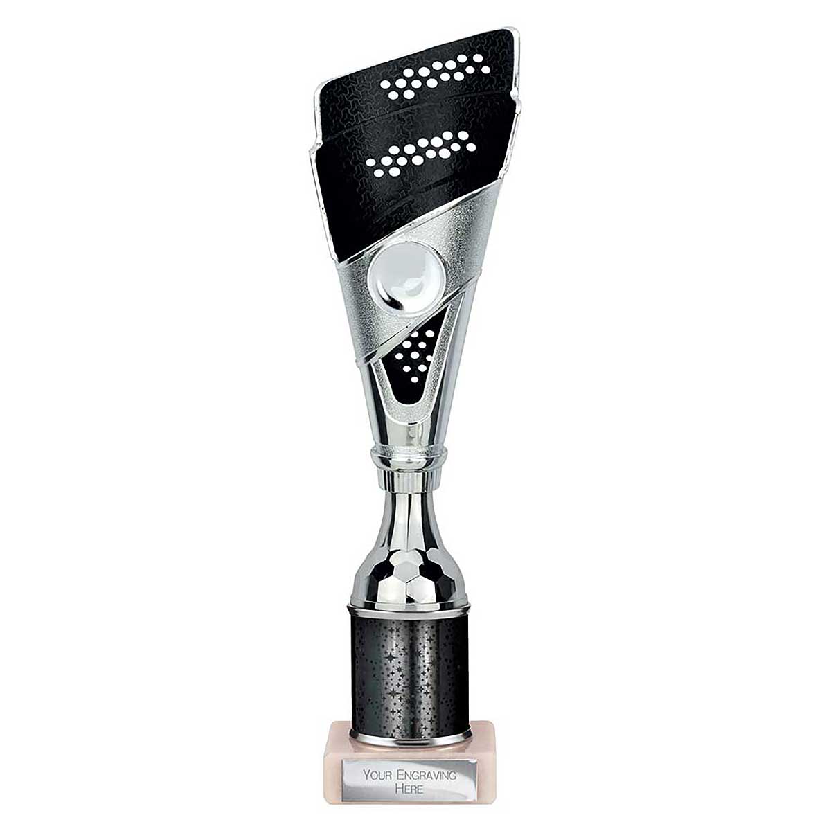 Black and silver Predator multisport trophy 285mm high Detailed plastic cone design with glitter column & stone base Engraving plate and club badge can be applied to the front