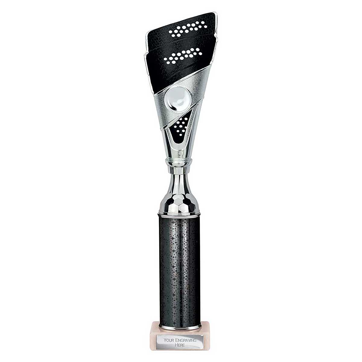 Black and silver Predator multisport trophy 360mm high Detailed plastic cone design with glitter column & stone base Engraving plate and club badge can be applied to the front