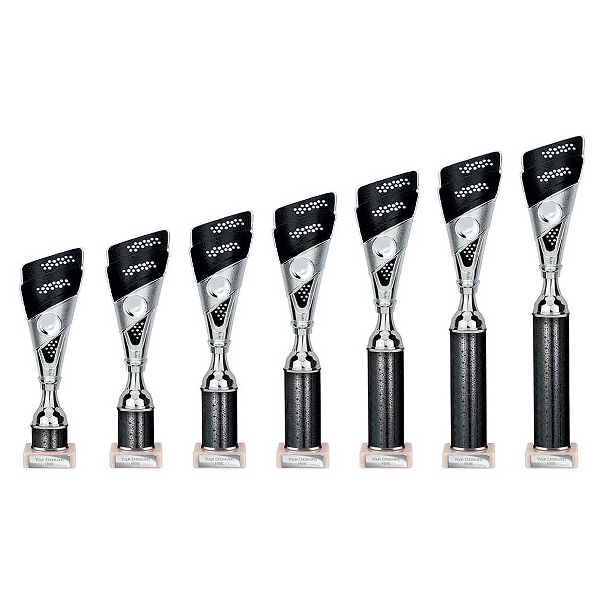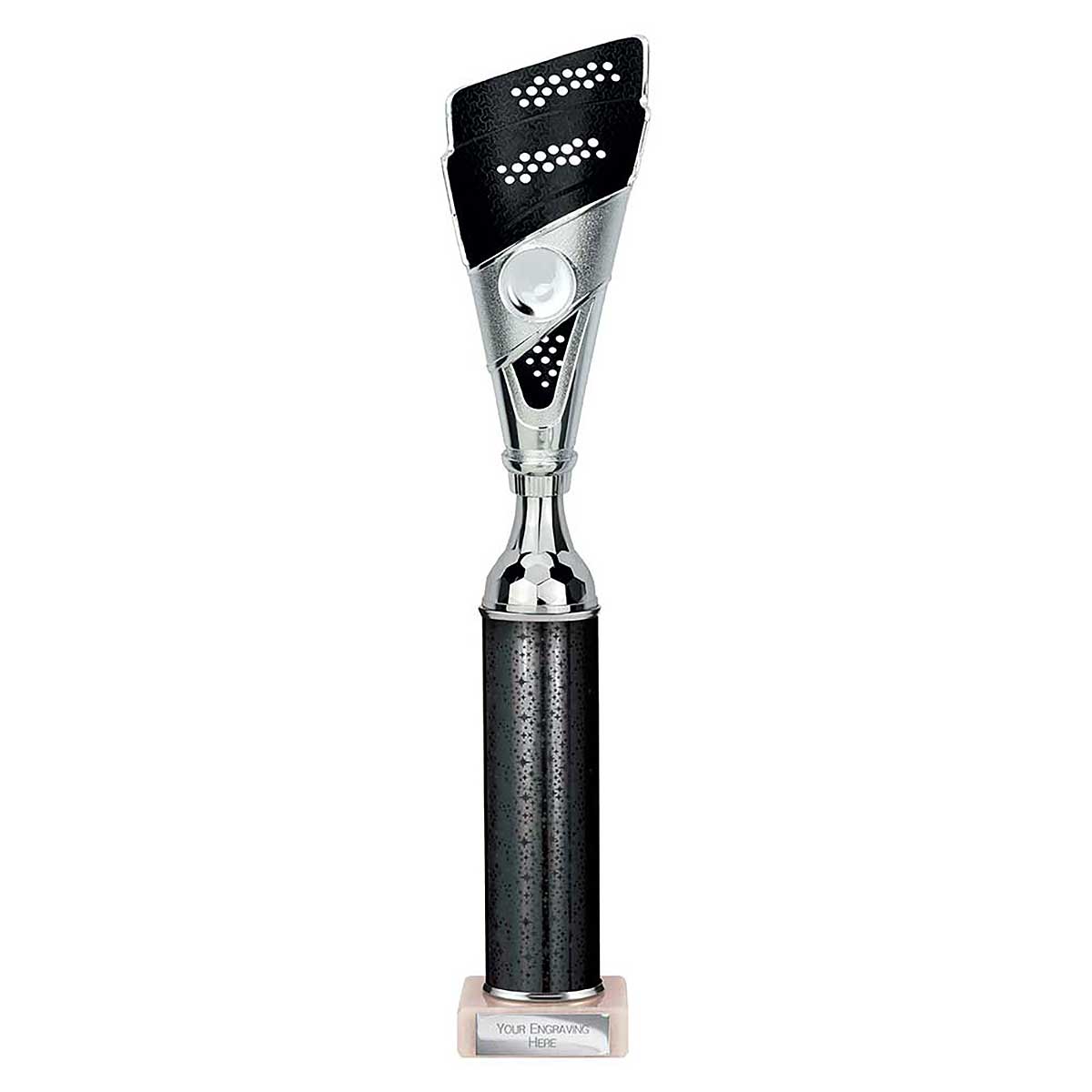 Black and silver Predator multisport trophy 410mm high Detailed plastic cone design with glitter column & stone base Engraving plate and club badge can be applied to the front