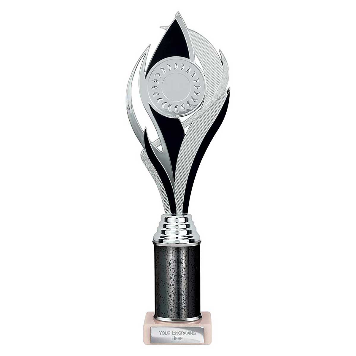 Black & Silver Super Volcano Trophy 310mm high Moulded plastic design on a superstar glitter column and stone base Engraving plate and club badge can be applied to the front