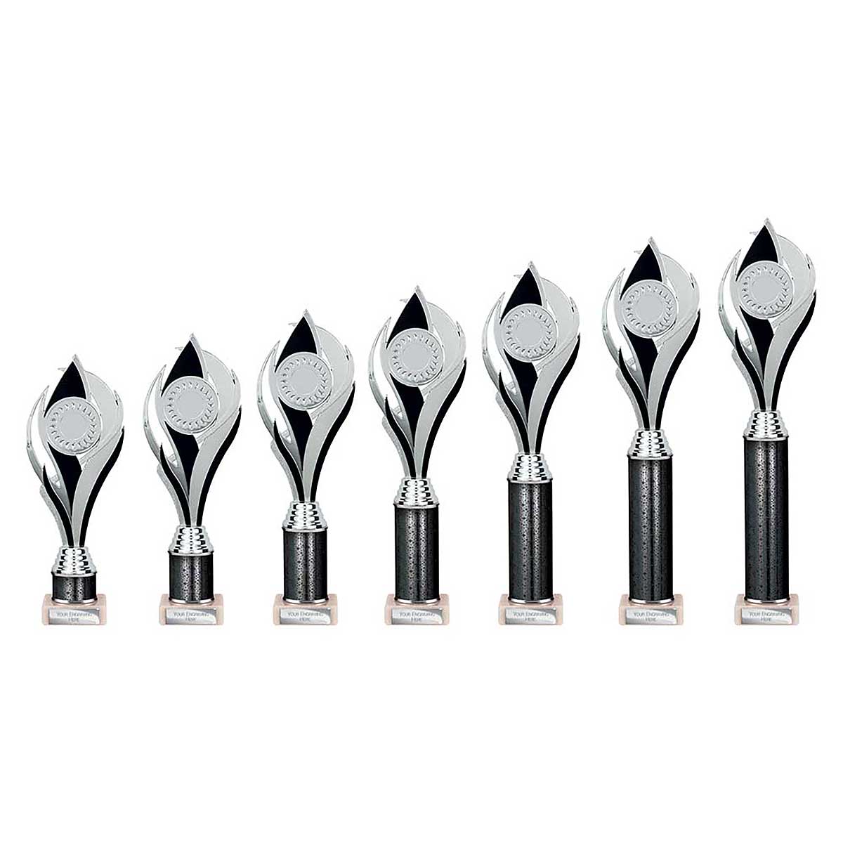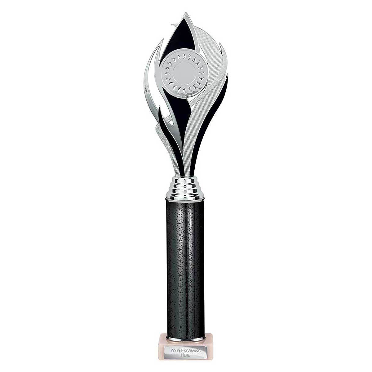 Black & Silver Super Volcano Trophy 410mm high Moulded plastic design on a superstar glitter column and stone base Engraving plate and club badge can be applied to the front