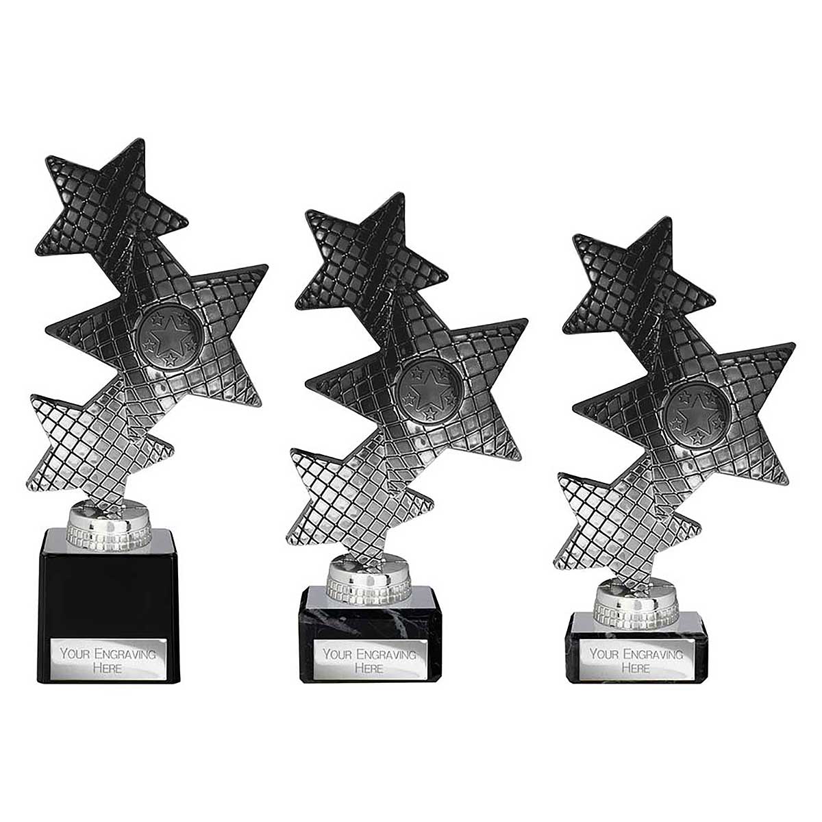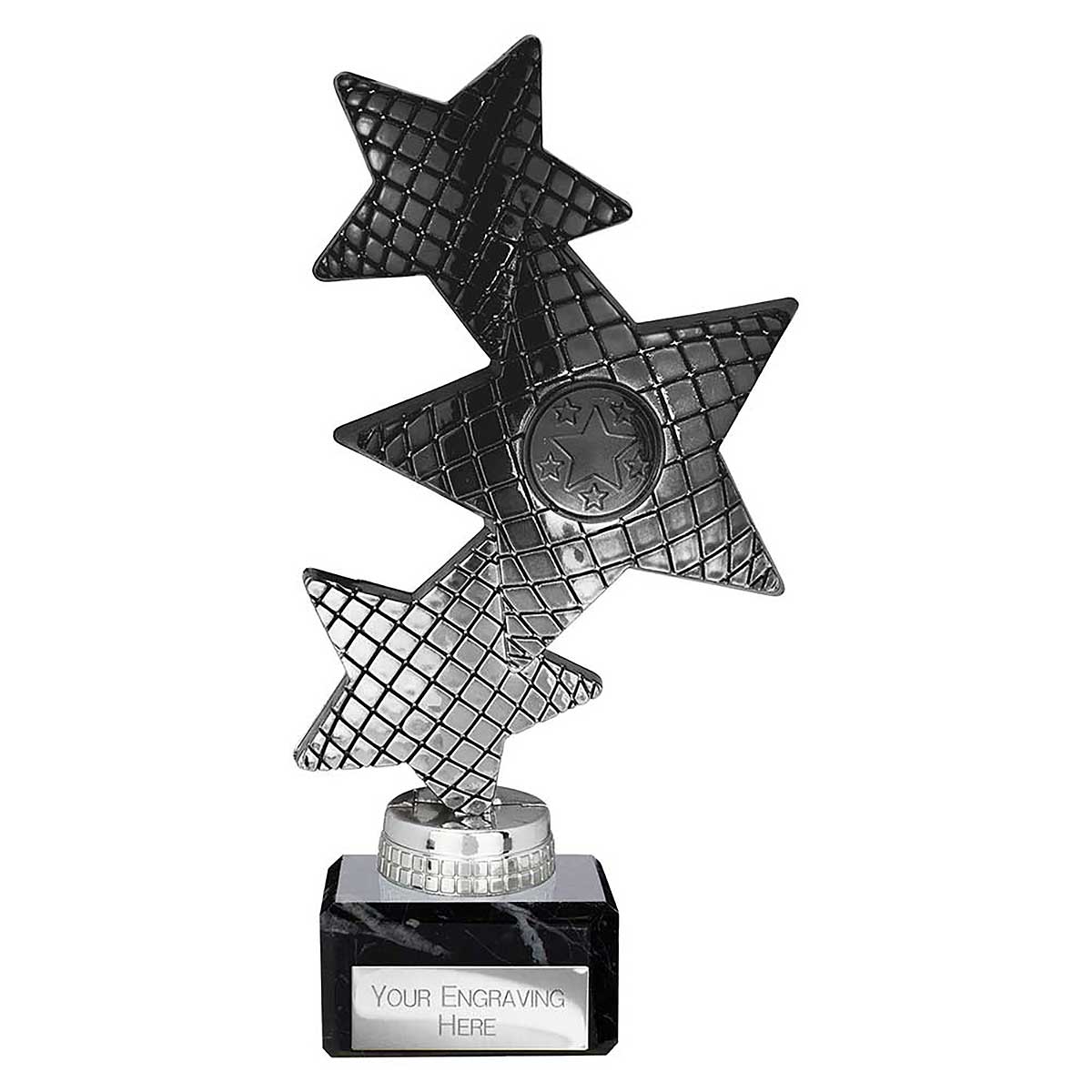 Black & Silver Trinity Star Trophy 195mm highMoulded plastic design on a black marble baseEngraving plate and club badge can be applied to the front