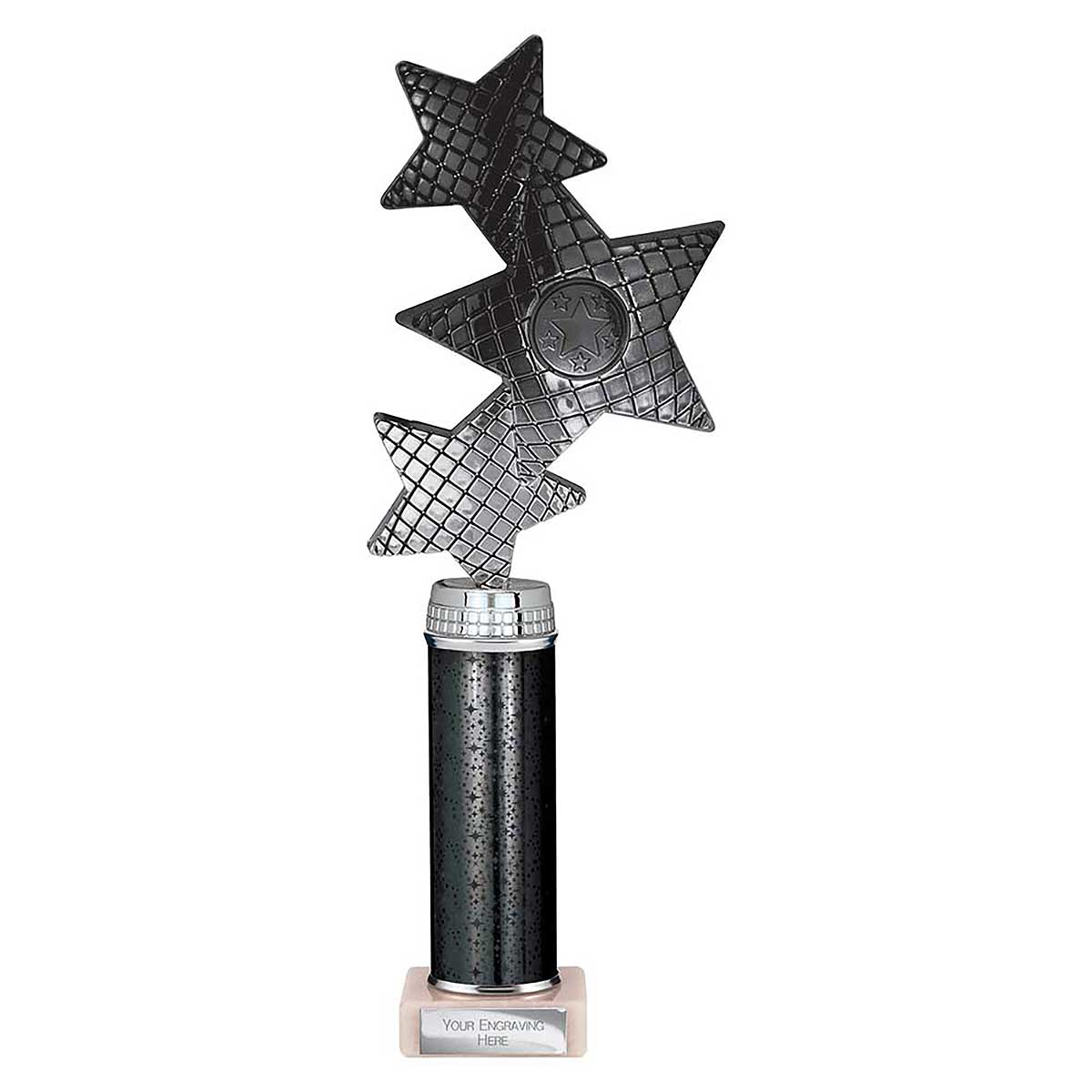 Black Silver Trinity Super Star Trophy 315mm highMoulded plastic design on a superstar sparkly column and stone baseEngraving plate and club badge can be applied to the front