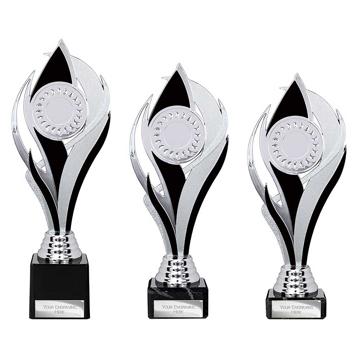 Black and silver Volcano Trophy 240mm high moulded plastic design on a black marble baseEngraving plate and club badge can be applied to the front