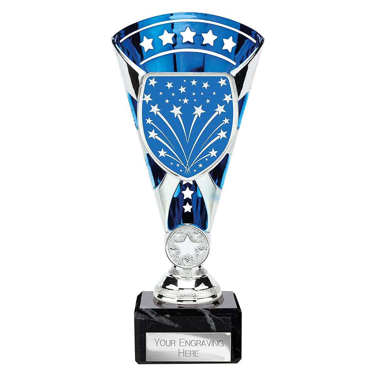 Blue Silver Cobra Cup Trophy 210mm Star design sticker on the front of the black marble base A custom sticker, engraving plate and club badge can be applied to the front
